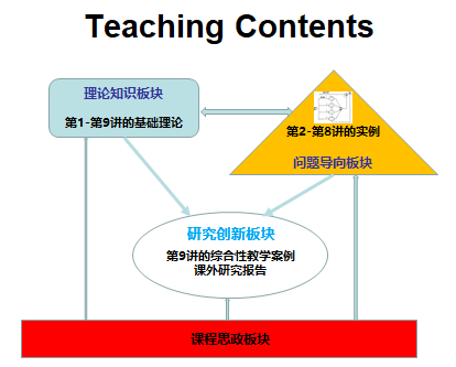 生物医学信号智能处理是医疗仪器和计算机辅助临床诊疗的核心技术,与人民健康和国家兴旺密切相关。因此,在教学过程中,注重引导学生带着心系人民健康和祖国发展的情怀学习该课程。整个课程教学内容由理论知识、问题导向、研究创新和课程思政四大板块组成,它们之间的关系如下: